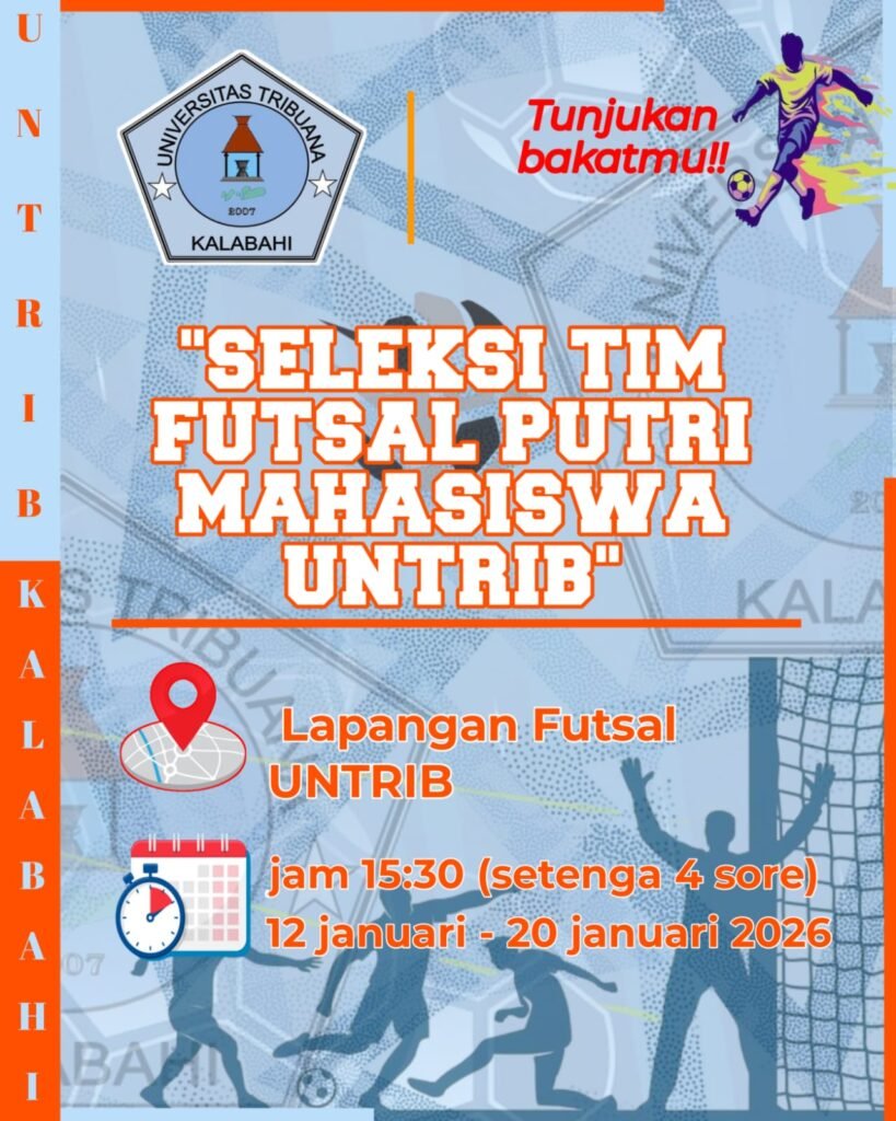 KALABAHI, UNTRIB News – Dalam upaya menjaring bibit unggul di bidang olahraga dan memperkuat representasi universitas dalam kompetisi tingkat regional maupun nasional, Universitas Tribuana (UNTRIB) Kalabahi secara resmi mengumumkan pembukaan seleksi terbuka untuk Tim Futsal Putri Mahasiswa. Kegiatan yang mengusung tema “Tunjukkan Bakatmu!!” ini dirancang untuk mengidentifikasi mahasiswi yang memiliki keterampilan teknis, fisik, dan strategi bermain futsal yang mumpuni. Pihak universitas berharap melalui proses seleksi ini, akan terbentuk tim yang solid dan kompetitif yang mampu mengharumkan nama almamater di berbagai turnamen mendatang.