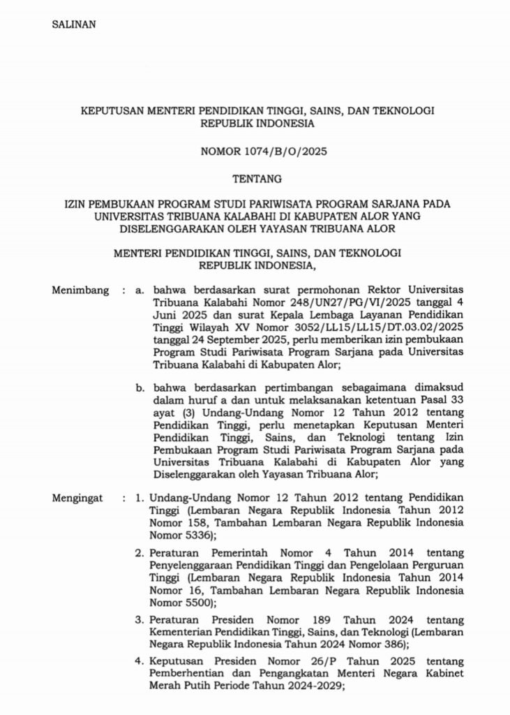 Kalabahi, 4 Desember 2025— Universitas Tribuana Kalabahi (UNTRIB ) akhirnya memperoleh izin resmi dari Kementerian Pendidikan, Kebudayaan, Riset, dan Teknologi Republik Indonesia untuk membuka program studi (Prodi) Pariwisata. Keputusan ini diharapkan dapat meningkatkan kualitas sumber daya manusia di bidang pariwisata dan berkontribusi terhadap pengembangan sektor pariwisata di daerah Alor.
